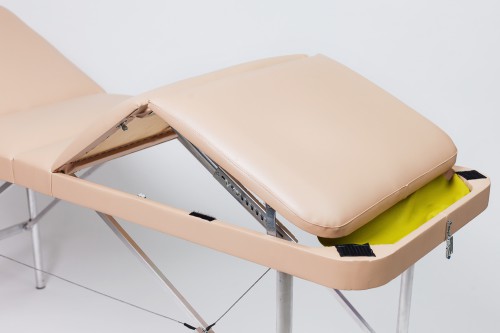 Конструкция стола — четырёхсекционная, с возможностью механической регулировки наклона спинки и ног. Это позволяет адаптировать стол под различные виды массажа и терапии, что очень удобно в работе.